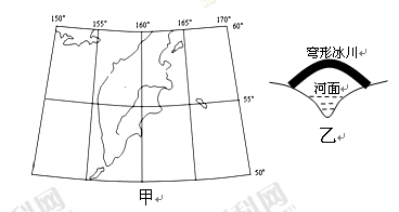 (1)从材料中知道该半岛有丰富的地热,从图甲看该半岛纬度高,看图乙穹形冰川悬在河面上方,说明上冷下热。先解释河水为什么不容易结冰,因为地热丰富,多温泉,河水温度较高,河面难结冰。再来分析穹形冰川的成因,水汽来自河水的蒸发,因为河水温度较高,蒸发较强,水汽充足,河面多水汽;因为纬度较高,气候寒冷,离开河面气温就很低,水汽在离河面一定距离的河岸上遇冷结冰,逐渐发育而成穹形冰川。