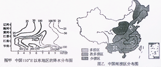 2、单选题 读图甲“我国110oE以东地区降水分布图”及图乙“中国雨涝区分布图”,回答下列各题。