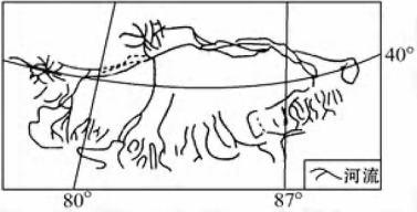 本题解析:由图示可以获取以下主要信息:①该区域为80°E附近,②河流呈放射状分布,③图中河流多为季节性河流。解决本题的关键是判断出该地形区为塔里木盆地地区。这里距海遥远,受海洋影响小,降水稀少,加之盆地地形使河流呈放射状分布。