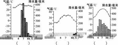 (1)A、B、C三地虽位于同一纬线上,但气候差异却很大。下图为A、B、C三地的气温曲线和降水柱状示意图,请把字母填在对应的括号中。