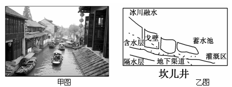 小题1:河道形成“井”字形,有河有街必有桥,因桥成市,因桥成街,桥桥相望,桥桥相连……桥下流水潺潺,两岸院墙斑驳,一叶轻舟,徜徉在小河之上;听一曲吴歌小调,与身着蓝印花布的船娘聊聊家常……结合材料和甲图,该景观位于下列哪个地区