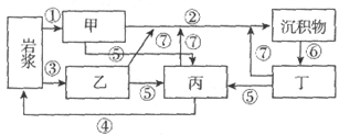 【小题1】图中甲、乙均由岩浆所形成,为岩浆岩,其中甲形成于地表且可直接变成沉积物,说明为喷出型岩浆岩,则乙为侵入型岩浆岩;丁由沉积物所形成,为沉积岩,则丙为变质岩。