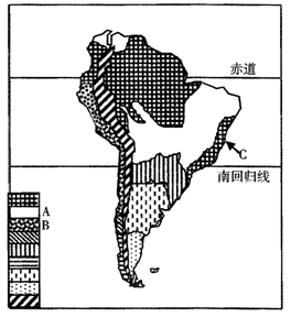 (3)图中字母B代表的自然带是_______________,其在南美洲的分布特征是_______________,形成这一特征的影响因素有________________________________。(5分)