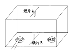 5、单选题 在一个长、宽、高分别是2米、1米和1米且六面都封闭的透明玻璃柜内,底面两侧分别放置一个电炉(有导线连到柜外)和一大盆冰块。在玻璃柜顶面中部的内壁贴一张下垂的纸片A,在玻璃柜底面中部的内壁贴一张竖立的纸片B(如下图所示)。在电炉通电一段时间之后,根据纸片A、B的偏动情况,可以模拟验证某一地理原理。