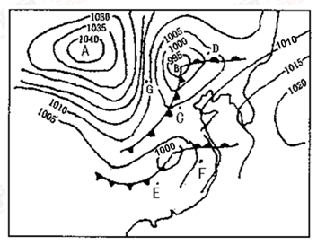 (3)C、G、E、F四地中,即将发生明显天气变化的是 、 ,原因是两地将受到 的影响,届时会出现的天气是________(2分)。