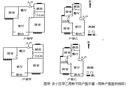 (1)售楼部给小王提供了两种不同户型示意图(材料一,图甲),若从日照角度考虑,你认为小王会选择哪种户型,试说明原因。(3分)