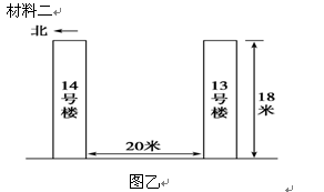 (2)小王欲在14号楼一楼购买住宅,通过实地测量获得相关数据(图乙),请你根据材料结合所学知识判断:14号楼一楼是否终年都能在正午时被太阳照射,并写出你的计算过程和判断理由。(6分)
