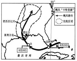 4、单选题 2005年8月25—29日,时速高达233千米的“卡特里娜”飓风袭击了美国东南部墨西哥湾沿海地区,造成数百人伤亡和失踪,百万人流离失所,很多城市一片汪洋。下图是该飓风活动路径图示。据此回答各题