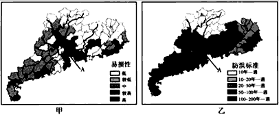 1、综合题 下图甲、乙分别示意广东省社会经济易损性和防洪标准。读图,结合有关知识,完成下列各题。