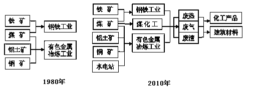小题1:直接读图,图示该地区1980年、2010年的工业结构均为资源型工业,故大量消耗矿产资源,而导致该地区的矿产资源减少。故选A项