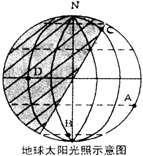 1、综合题  读“太阳光照图”(阴影表示黑夜,非阴影表示白天),回答下列问题。(10分)
