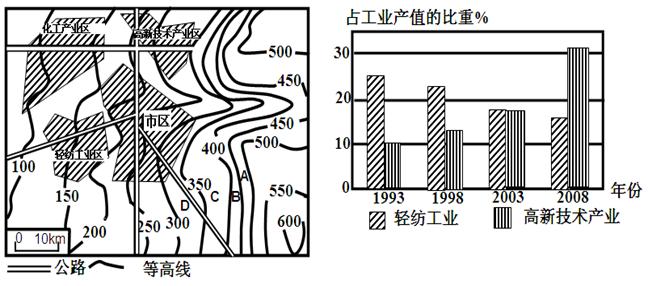 材料二? M市等高线地形图?材料三? M市产业结构的变化图
