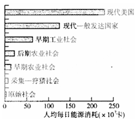 4、单选题  下图为“人类各发展阶段的人均每日能源消耗(包括直接消耗和间接消耗)统计图”,据此完成下列各题。