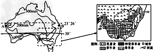 4、综合题 读澳大利亚年降水量分布图(左下图)和局部地区农业类型分布图(右下图),回答下列问题。?