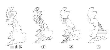 1、单选题 读“大不列颠岛地形及某三种地理要素分布图”,结合所学知识,完成下列小题。
