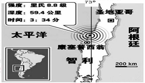1、单选题 2010年当地时间2月27日凌晨3时34分,位于智利马乌莱地区外海发生里氏8.8级 大地震,震源位于海底59.4公里,震中距智利城市康塞普西翁100公里 ,死亡人数已超过 300人。据此回答下题。