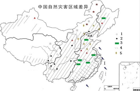 本题考查地理图表的判读能力。根据自然灾害的分布判断1主要分布在西南地区,为地震;2分布在山区,为滑坡;3分布在东部平原地区,为洪涝;4分布在东南沿海地区,为台风;5分布在北方地区,为干旱。所以本题选择C选项。