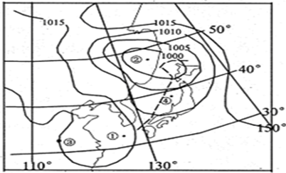 【小题2】根据图上所示:此时海洋上为低气压,③所在的地方受高压控制,根据风从高压吹向低压,北半球向右偏转,可以判断出③为东南风,所以D正确。