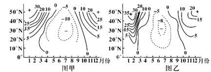 E代表)气压梯度(大陆气压与海洋气压之差,单位:百帕)的时空分布状况。图甲表示多年平均情况,图乙表示某年情况。读图完成下列问题。