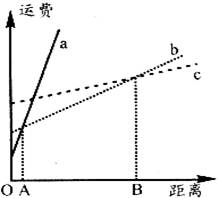 2、单选题 读不同运输方式距离与运费的关系图(下图),若图中a、b、c分别代表水运、铁路与公路运输中的一种。回答下列各题。