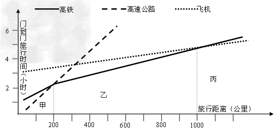 3、单选题 ?随着生活节奏的加快,人们出行对时间因素考虑逐渐增多,且时间因素可能成为选择交通方式的主导因素,读“三种交通运输方式从门到门所需时间示意图”,回答1~3题。
