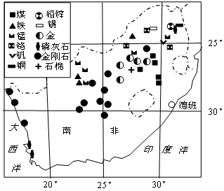 4、单选题 《联合国气候变化框架公约》第十七次缔约方会议于2011年11月28日在南非德班召开。右下图是南非矿产资源分布图,读图回答下列问题。