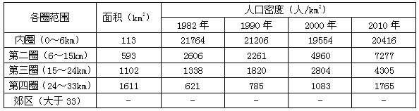 2、单选题 我国北方某大城市自1982年以来,人口大幅度增加,下表为该城市各圈人口密度、面积等数据。读表完成下列小题。