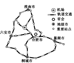 3、单选题 通勤指从家中往返工作地点的过程。正在建设的合肥经济圈实施公交化发展策略,规划至2020年建成1小时通勤圈。下图示意合肥经济圈轨道交通线网规划,完成下列各题。