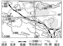 (1)读图,图中等高线数值大多在1000以上,说明海拔较高,等高线间隔大,说明地势起伏较小。所以地形以高原山地为主。结合经纬度及省区轮廓,可以判断图示区为内蒙古高原和青藏高原,铁路穿过的是甘肃省。