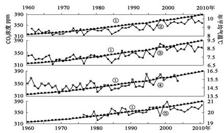 4、单选题 2013年5月2日《中国科学报》:据美国夏威夷冒纳罗亚天文台测定的数据,大气二氧化碳(CO2)浓度日均值将于今年5月初超过400ppm。图7是CO2,浓度曲线(①)与全国温度曲线(②)、黄河流域温度曲线(③)、江苏省温度曲线(④)、喜马拉雅山南麓尼泊尔温度曲线(⑤)比较图。读图回答题。