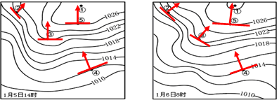 3、单选题 下图示意北半球某区域2012年1月5日14时和6日8时海平面气压(单位:百帕)分布,读图完成下列问题。