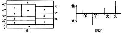 【小题1】图甲中a地终年受赤道低压带控制形成热带雨林气候;r、s、t三地位于中低纬度大陆东岸,均受冬夏季风交替控制,分别形成温带季风气候、亚热带季风气候和热带季风气候;e位于10°N——20°N之间大陆西岸地区,受赤道低压带和信风带交替控制形成热带草原气候;d终年受副热带控制热带沙漠气候;c位于30°N——40°N之间的大陆西岸地区,受西风带和副热带高压带的交替控制形成地中海气候;b终年受西风带控制形成温带海洋气候;m位于大陆内部,终年受大陆气团控制形成温带大陆气候;n位于高纬度地区,受极低气团控制形成苔原气候或冰原气候。