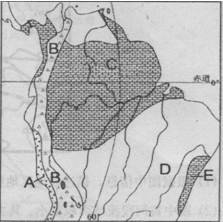(4)C、E两地气候类型相同。C气候区面积广大,其主要原因是_____简述E地气候类型的成因。(6分)
