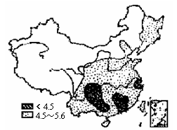 5、单选题 图是 “我国某年份酸雨分布图”, 读图回答下列各题。