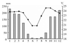 3、单选题 读世界某地区气温曲线和降水量柱状年内变化示意图,完成下列各题。