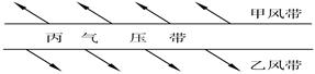 试题分析:读图可知,甲风带和乙风带从丙气压带吹向两边,故为高压带,排除AD。甲风带为西南风,乙风带为西北风,故应该为南半球的副热带高气压带。