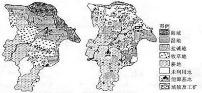 1、单选题 如下左图为20世纪50年代黄河三角洲土地类型分布图,右图为21世纪初黄河三角洲土地类型分布图,读两图完成下题。