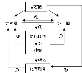 5、单选题 工业革命以来,人类大量使用石油、煤炭等化石燃料,从而加剧全球变暖,带来气候多变、灾害丛生等严重后果。为此全社会在倡导发展低碳经济和低碳生活。图示意碳物质在地球各圈层中的循环过程,读图回答下列各题。