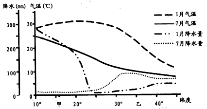 【小题2】结合前面分析,该国是澳大利亚,位于南半球。自北向南纬度升高,所以7月气温自北向南递减,A对。甲地纬度低,位于热带,气温年较差比乙地小,B错。l月降水量为北多南少,C错。根据图中降水量曲线,甲地降水季节变化大于乙地,D错。