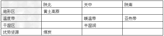 (2)人们习惯上以北山和秦岭为界将陕西分成陕北、关中和陕南三大自然区域,读图并结合所学知识完成下表: