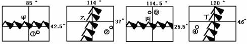小题1:我国季风区与非季风区的界线为大兴安岭—阴山—贺兰山—巴彦喀拉山—冈底斯山脉,结合图示四座山脉的经纬度位置判断:甲为天山;乙为太行山;丙为南岭;丁为大兴安岭。
