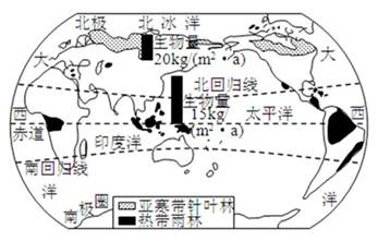 (4)直接根据图示赤道附近热带雨林的生物生长量和高纬地区的亚寒带针叶林的生物生长量判断即可。由于两种植被的分布纬度差异导致了太阳辐射量的差异而影响生物生长量。