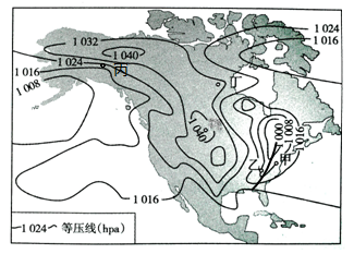 (1)冬季(1分)。此时图示等压线显示北美洲大陆中高纬地区以高压占据主导(2分);说明北美大陆比同纬度的海洋降温快,气温低,在中高纬度的大陆内部形成冷高压中心(2分)。所以最可能是冬季。