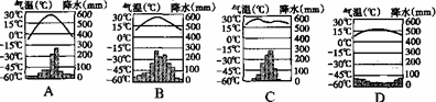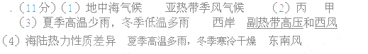 (1)A在北纬30°—40°之间的亚欧大陆西岸,在地中海沿岸,是地中海气候。D在东亚,北纬25°—35°之间,是亚热带季风气候。