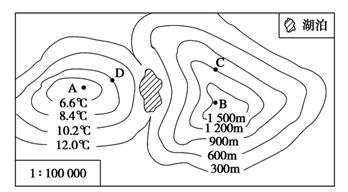 本题解析:C处和和湖泊之间隔着山脊,不能看到湖泊,A错误;A、B、D三处的地表水都可以通过坡面径流汇入图示湖泊中,B错误;根据海拔高度和气温的对应关系,图中海拔1200米处的气温值为6.6°C,海拔每上升100米,气温下降0.6°C,B处海拔范围在1500米和1800米之间,气温范围应介于3℃和4.8℃ 之间,C正确, 根据图中海拔和气温的对应关系,A处海拔应介于1200米和1500米之间,D错误。