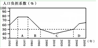 3、单选题 人口负担系数也称抚养系数,是指人口总体中非劳动年龄人口数与劳动年龄人口数之比,用百分比表示 (人口负担系数=(14岁及以下人口数+65岁及以上人口数)/(15~64岁人口数)×100%)。下图为“我国人口负担系数变化图”。读图,回答题。