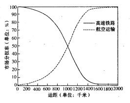 5、单选题 按照《中长期铁路网规划》,我国将建设多条铁路快速客运通道。结合下面“不同距离条件下高速铁路与航空运输两种运输方式的竞争关系模型图”,回答下列问题。