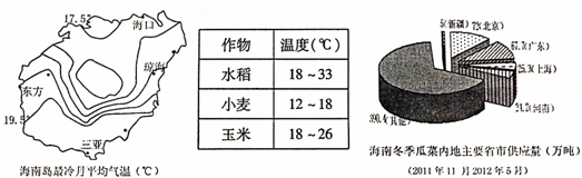 3、单选题 南繁是秋冬季节全国各地到海南从事农作物品种选育、种子生产和种植鉴定等活动;海南冬季大量瓜菜销往内地省市。读海南岛最冷月平均气温分布图,水稻玉米发芽适宜温度表和海南冬季瓜菜内地主要省市供应量图,完成下列问题。
