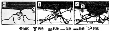 (2)从A图看出,城市初期主要呈现___________分布的特点;从B图看出,影响城市空间形态变化的主要因素是_________;从C图看出,该地城市发展重心又转向________。