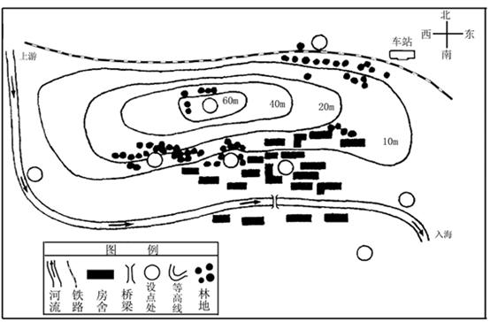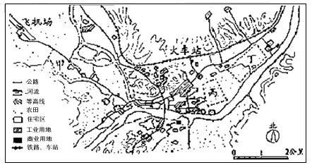 5、单选题  下图为我国南方某城市规划前的地域结构略图,该市工业以茶叶、食品加工为主,辖区内有世界级自然风景名胜(距市中心直线距离40多千米)。读图回答1—2题。
